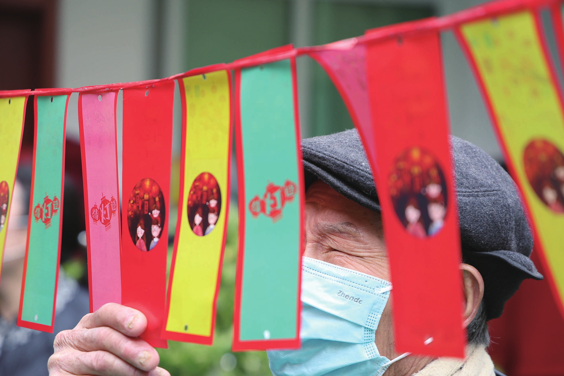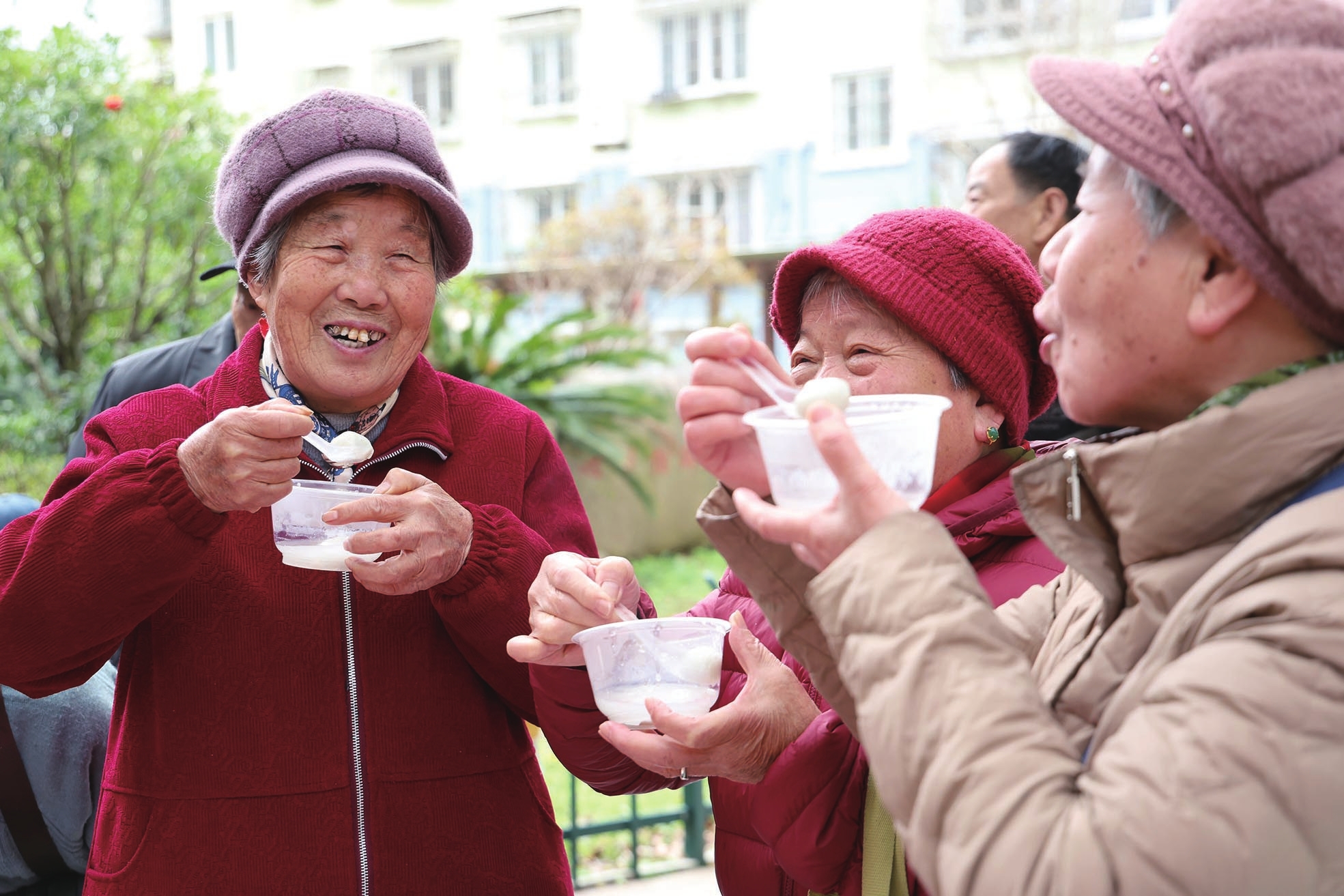 3月2日,定海区合源新村小公园,当地居民正在开心地品尝汤圆