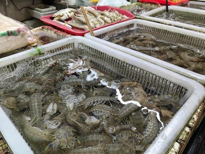 专营虾蟹的卢老板摊前,皮皮虾成为主角。“刚上市不久,正逐渐进 入 旺季,现 在已经开始长膏了。眼下价格还比较高。比较小的目前卖70元一斤,大一点品质好一点的卖90元一斤。再过段时间价格会慢慢下来的。”卢老板说,“等到清明前后,皮皮虾产卵后肉质就会变瘦,想尝膏肥皮皮虾的要趁现在。”