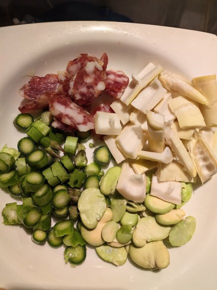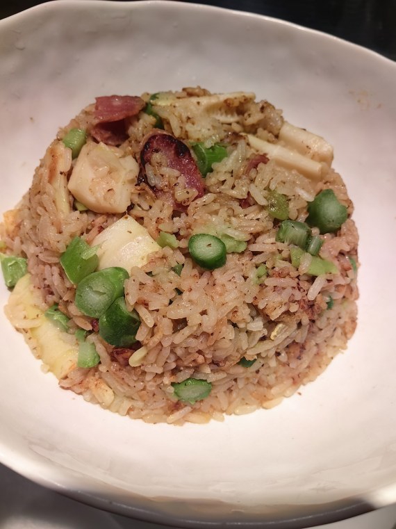 这道焖饭食材家常:芦笋、雷笋、新鲜蚕豆、腊肠、大米。
