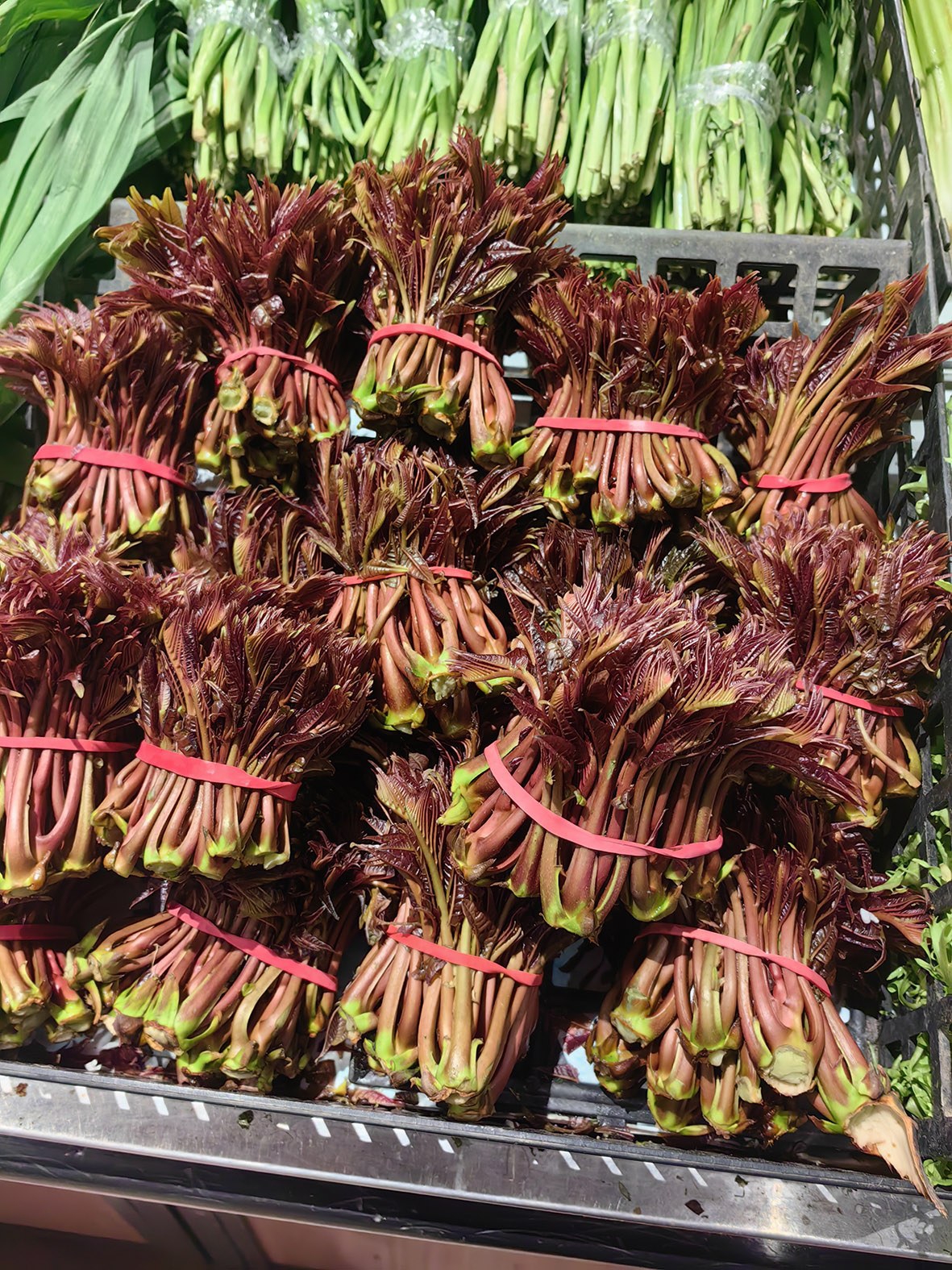 春菜争鲜上市 香椿价高依旧受宠走进长峙岛如心小镇的城市超市蔬菜区,各类春菜被摆在显眼位置。雷笋每公斤25.16元,蚕豆荚每公斤11.96元,而捆扎成束的香椿头标价每公斤71.96元,堪称“春菜金贵”。