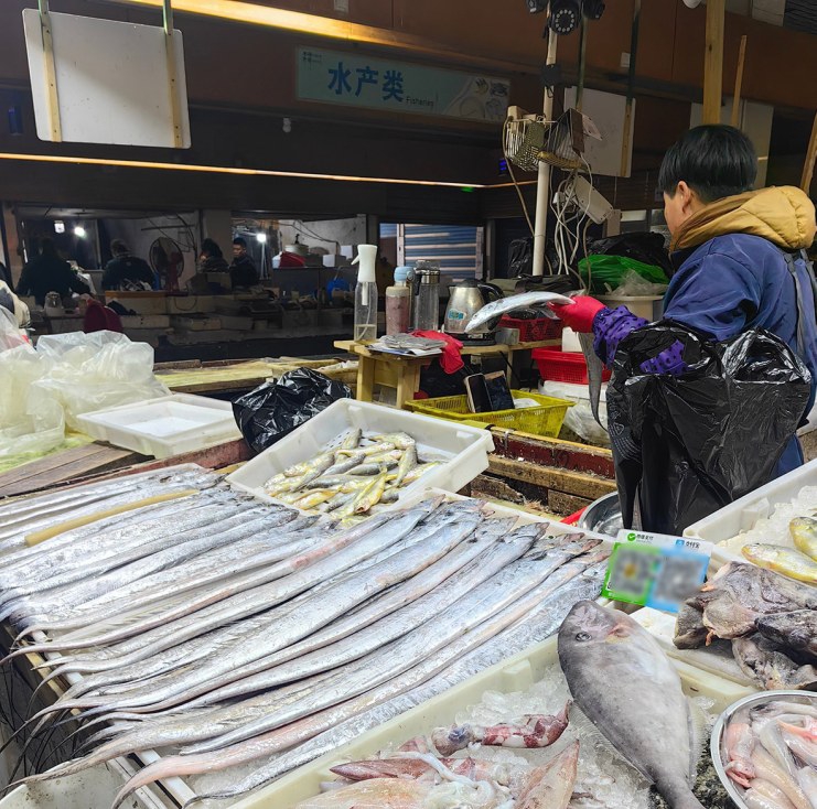 下午时分,新城老碶菜场海鲜摊位前依旧人来人往。摊主吴老板将带鱼按新鲜程度分档卖:“都是新上市的,早上90元一斤,下午80元一斤。”她一边给顾客装袋一边说,“前几天更贵,这条细一点卖130元一斤,宽一点的能卖到150元一斤。这两天价格下来了。现在的带鱼好吃,油脂足,买的人多。”