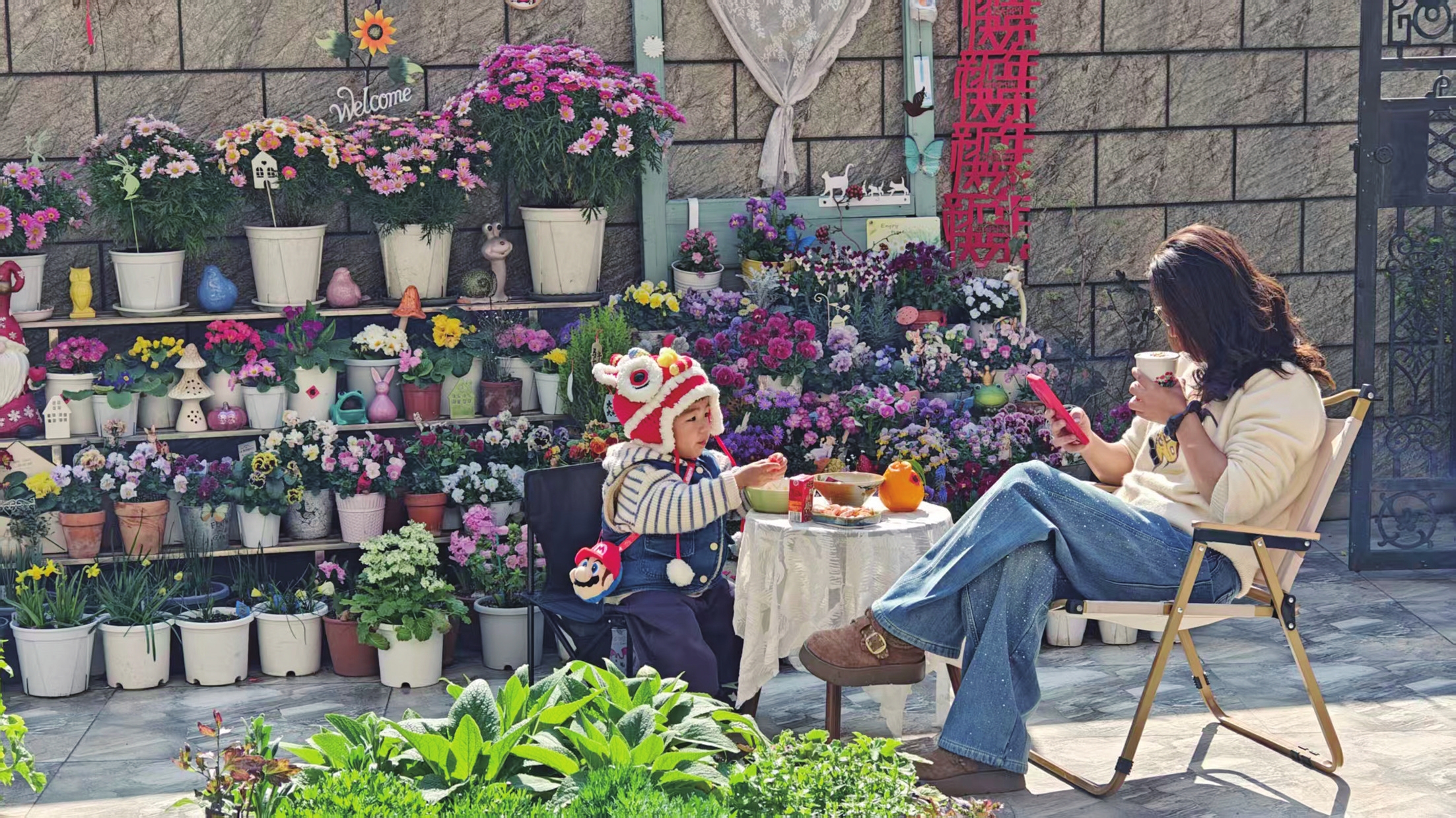 除了养花,小院也是一家人的生活乐园,天气晴好时,夫妻俩会在院子里烧烤,招待来访的亲朋好友,伴着花香与烟火气,享受闲暇时光。前阵子,住在新城的两个朋友过来“参观”她的小院,临走前,王璐瑶剪了一袋角堇花送给做甜品的朋友用来做蛋糕装饰。村里的邻居也常来小院看花,夫妻俩也乐于分享。花香飘出小院,也串起了邻里间的温暖。