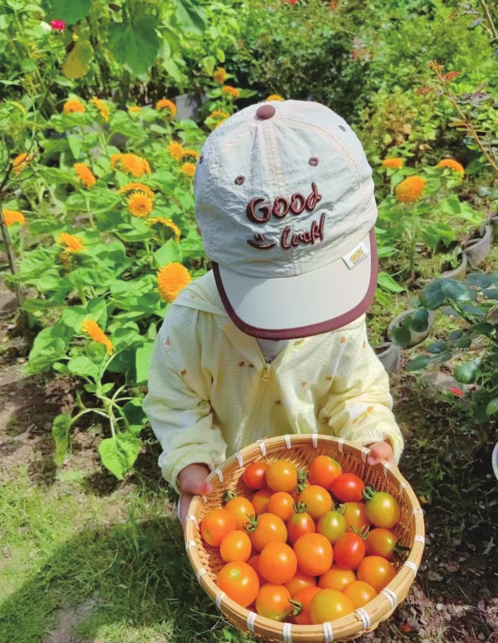在她的手机相册里,花草占了大半,每一盆花从冒芽到开花的模样都被一一记录,藏着她养花路上的点滴印记。相册里也不乏温馨的日常,儿子蹲在花草旁好奇打量,或是捧着一家人亲手种的蔬果吃得香甜,花香伴着童真,满是生活暖意。