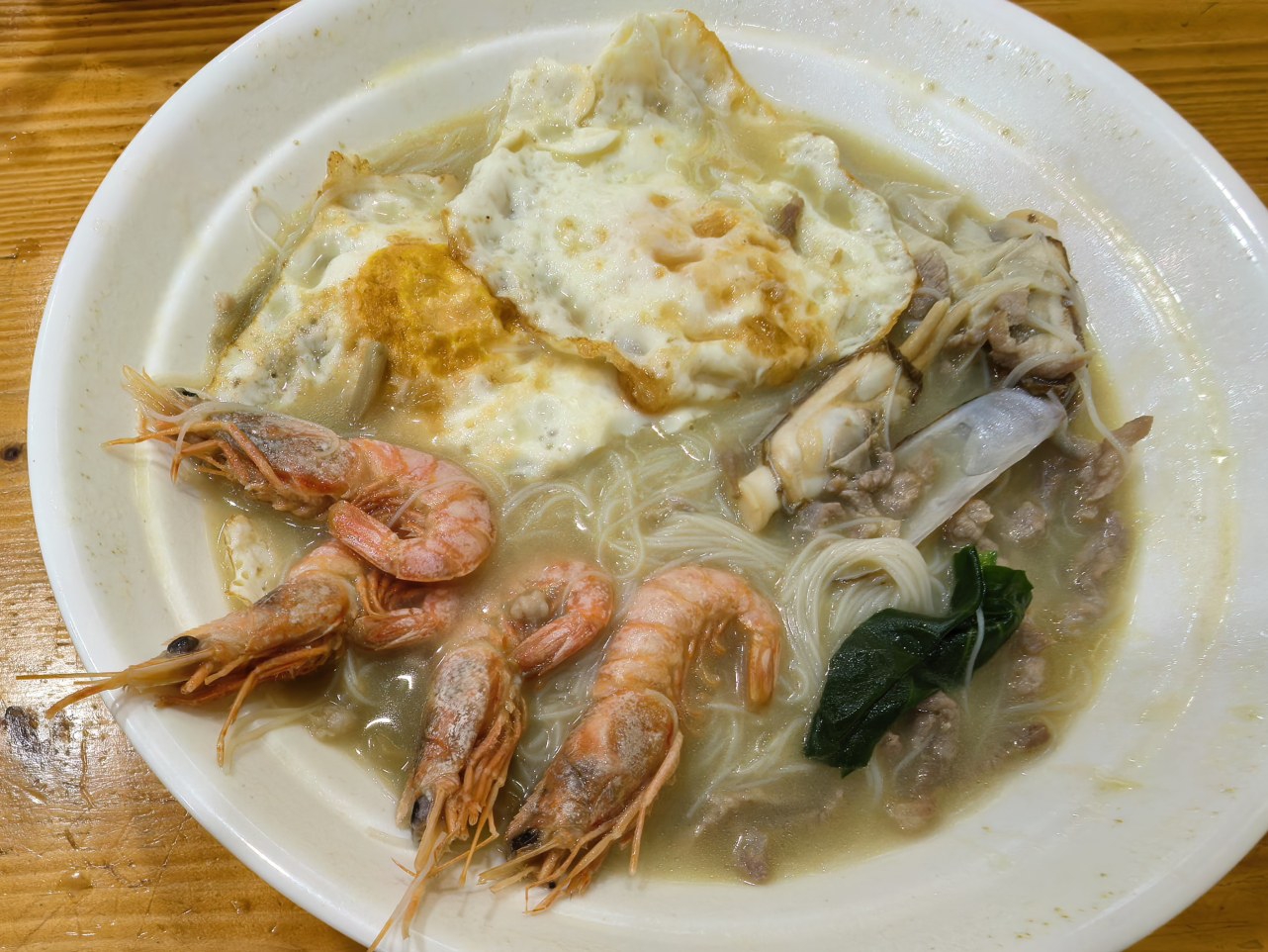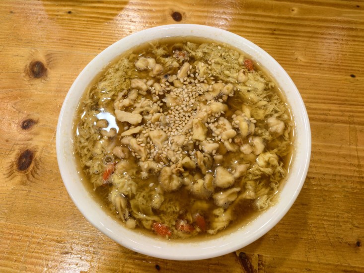 整碗面的分量很足,4只红虾,几个蛏子,还有荷包蛋、青菜、豆皮、肉丝、黄花菜……淡黄色的汤汁隐隐飘来生姜的味道。先来口汤,一入嘴便是浓郁海鲜味道,舌根处会明显感受到生姜的辣,但确实辣得恰到好处,让我这个平日不爱吃姜的人也能接受。只一口,全身便升腾起一股暖意,将刚刚在门口等待的寒冷消除大半。