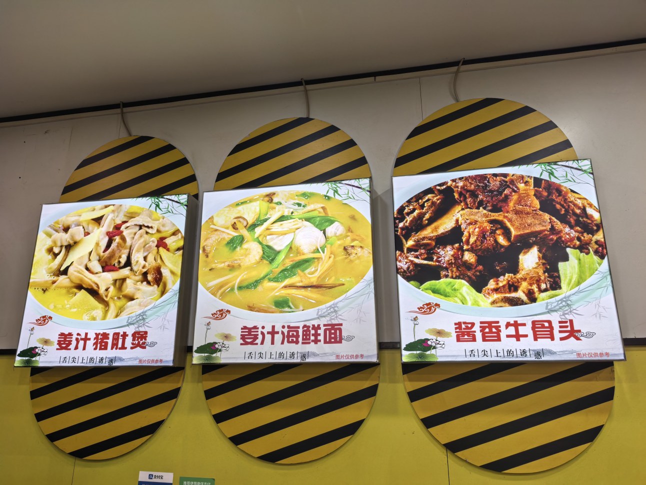 我们也紧跟着进店。小店不大,没有精致的装修,厨房和餐厅仅隔着一条帘布,右边墙上展示了台州家常小炒,涵盖炒菜、汤类、煲类、盖浇饭、甜品、卤味等多个种类,左边则着重展示三样招牌菜,姜汁猪肚煲、姜汁海鲜面、酱香牛骨头。