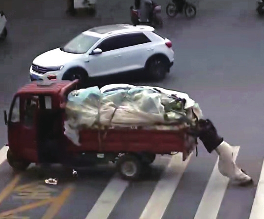 这时,旁边一辆红色小车上跑下来一位女士,快步上前,奋力推车,将三轮车推至安全区域,随后迅速返回车上。