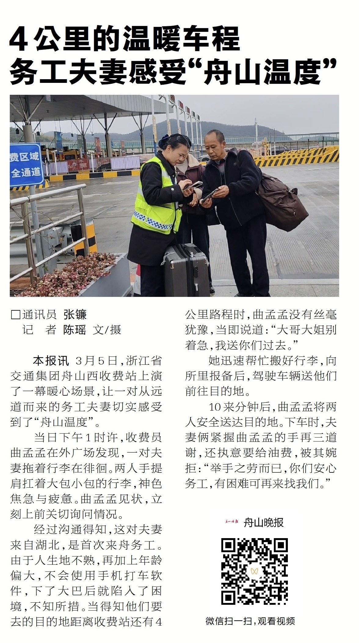 3月5日,浙江省交通集团舟山西收费站上演暖心一幕:一对首次来舟务工的湖北夫妻,下了大巴后因不会使用手机打车软件,在收费站外不知所措。收费员曲孟孟了解情况后,二话不说帮忙搬行李,向所里报备后驾车将他们送到4公里外的目的地(《舟山晚报》3月10日报道)。曲孟孟的这一脚“油门”,踩出了“舟山温度”,真是好样的。