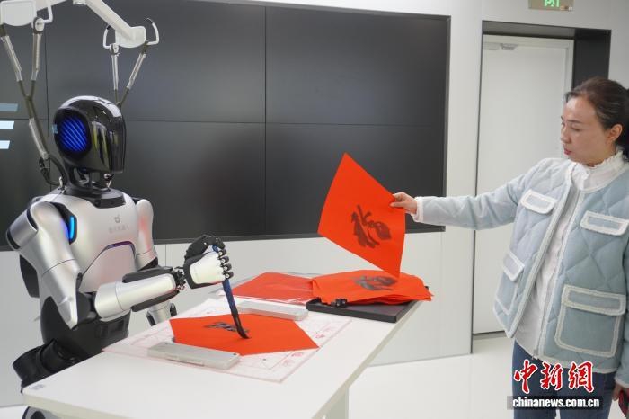 3月4日,河南郑州,中原异构人形机器人4S店吸引市民参观,这是河南首家人形机器人4S店。图为机器人写毛笔字。 中新社记者 韩章云 摄