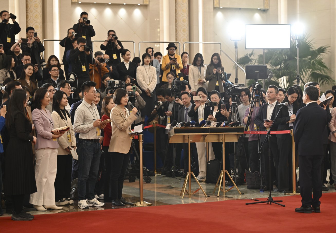 3月12日,第十四届全国人民代表大会第四次会议第三场“部长通道”集中采访活动在北京人民大会堂举行。这是记者在现场提问。