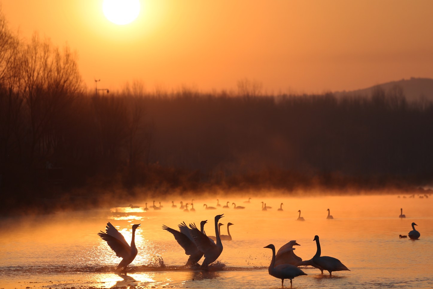 惊蛰节气过后,大批天鹅在辽宁省北票市红村天鹅湾栖息停歇,吸引人们前来观赏和拍照。