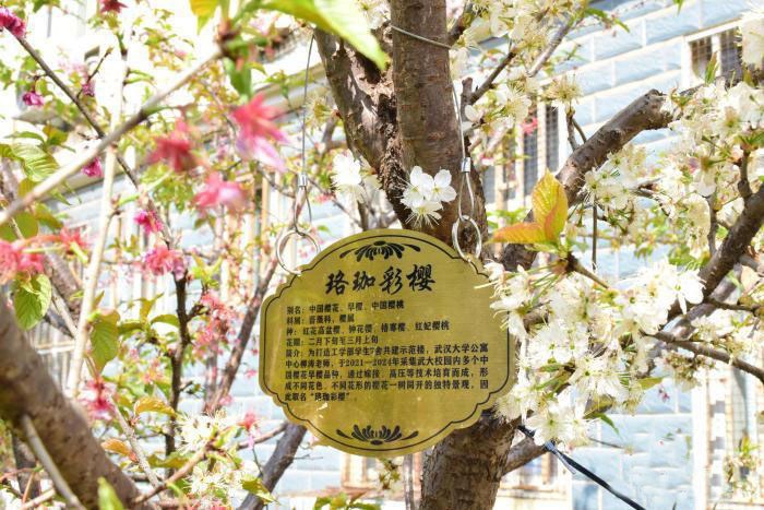3月13日,武汉大学工学部学生宿舍7舍前,数棵“珞珈彩樱”引人注目。每棵“珞珈彩樱”上,集聚红花高盆樱、红妃樱桃、钟花樱与椿寒樱4种樱花品种,开出粉色、洁白、玫红三种颜色的花,交织成一幅独特的画卷。据了解,“珞珈彩樱”由武汉大学公寓中心工作人员于2021年至2024年采集武大校内多个早樱品种,通过嫁接、高压等技术培育而成,花期在2月下旬至3月上旬。