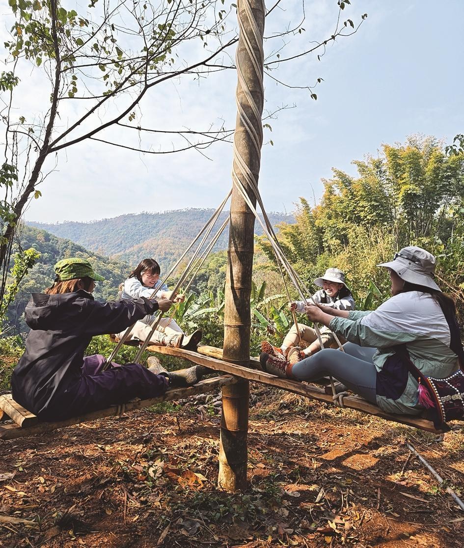 这是一段近乎垂直的陡坡,脚下铺满了被潮气浸得湿滑松软的腐叶,每一步都必须踩得极稳、极小心。我们手扶藤蔓和麻绳,互相协助,咬牙坚持,终于抵达终点。稳稳落地那一刻,所有疲惫瞬间烟消云散。